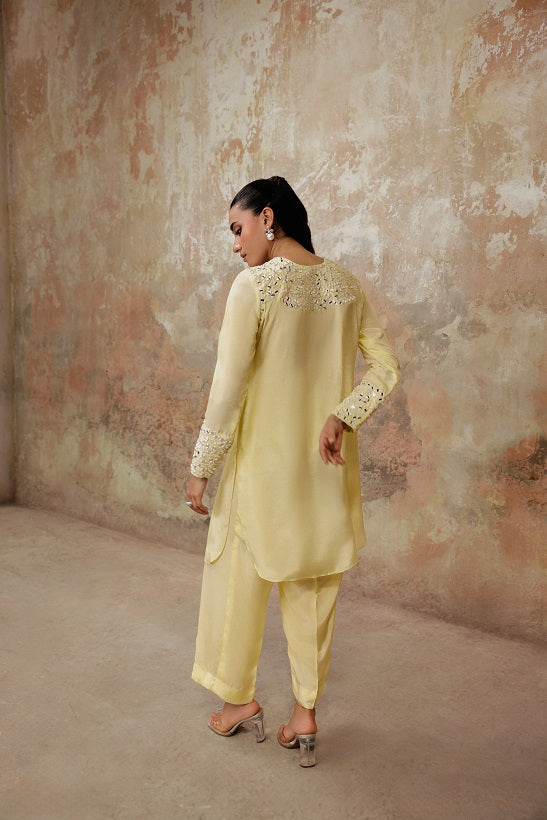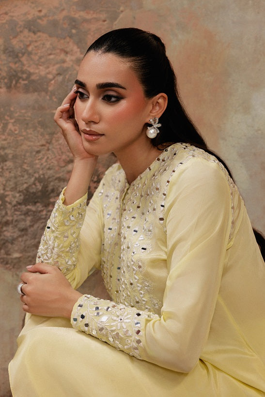 This enchanting ensemble is a celebration of light and craft, designed to make you the center of every festive moment. Crafted from crisp Grip Silk, known for its structured drape and luminous sheen, the outfit holds its shape beautifully while allowing the vibrant color to radiate.