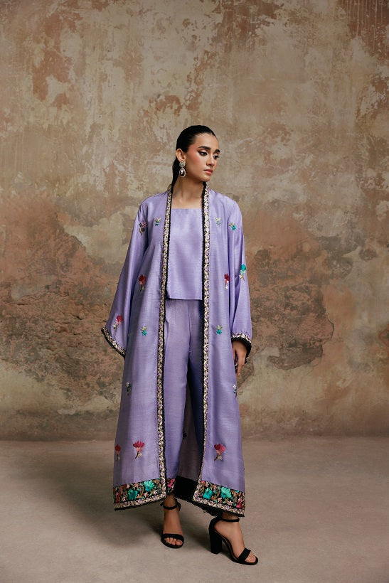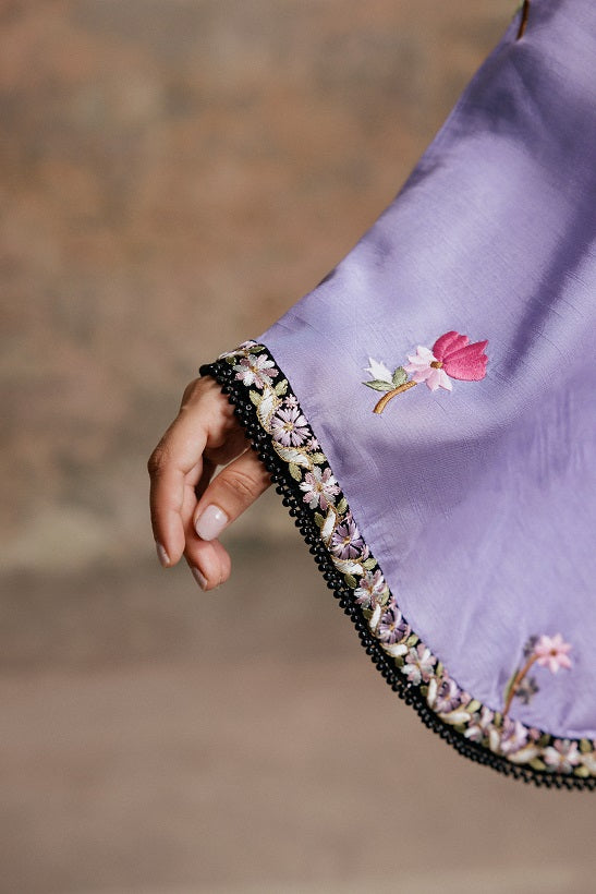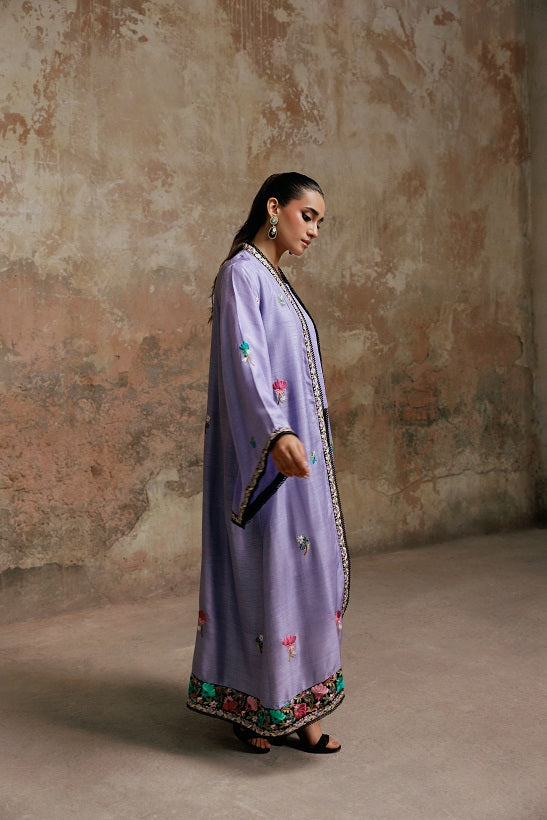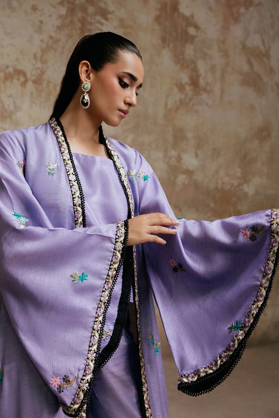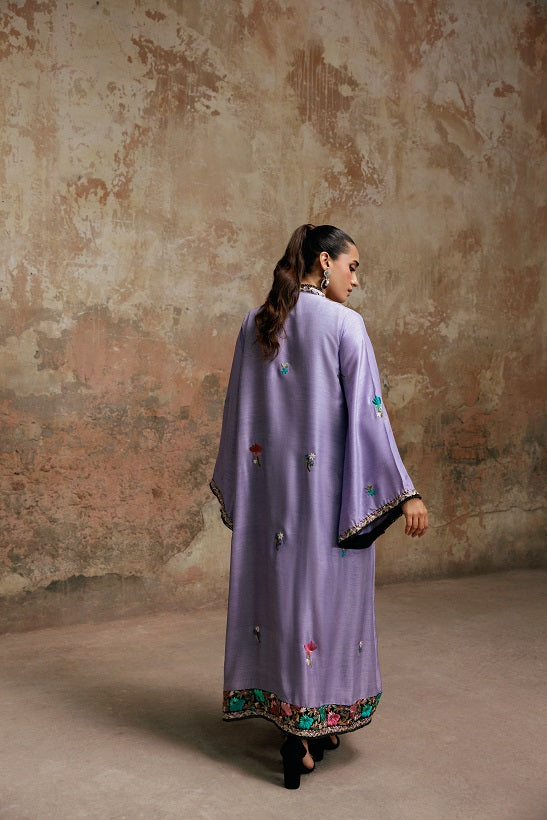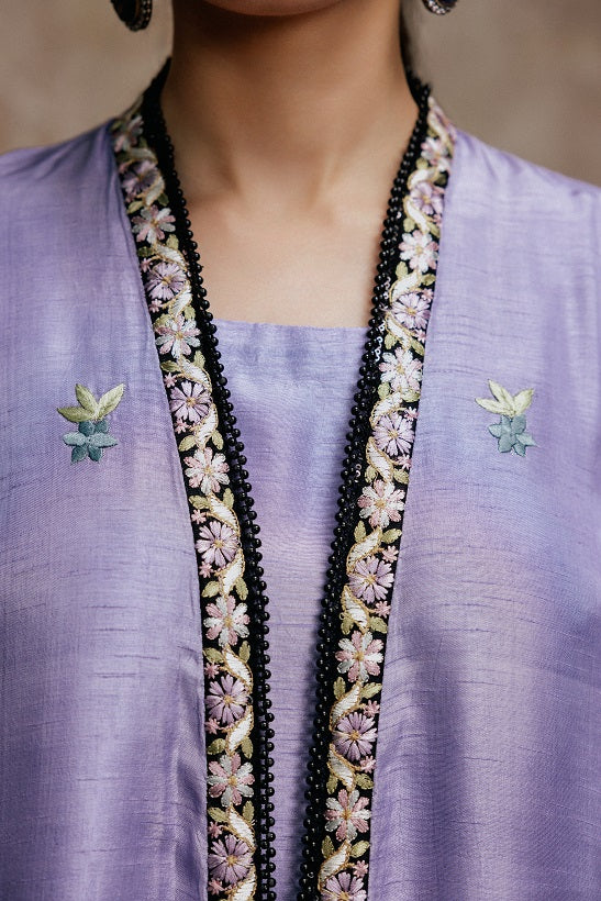The Embroidered Cape Jacket commanding attention is the breathtaking Korean Silk Jacket in the rich Viola hue. Its surface is a canvas for exquisite resham embroidery in exquisite patterns.